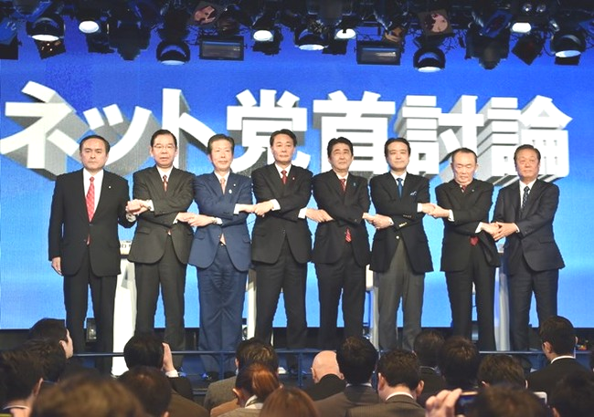 Đa nguyên văn minh dân chủ- Thủ tướng Shinzo Abe (LDP) (thứ 4 phải) và lãnh đạo 7 chính đảng khác tại cuộc tranh luận ở Tokyo, trước cuộc bầu cử Hạ viện. (Ảnh: AFP)